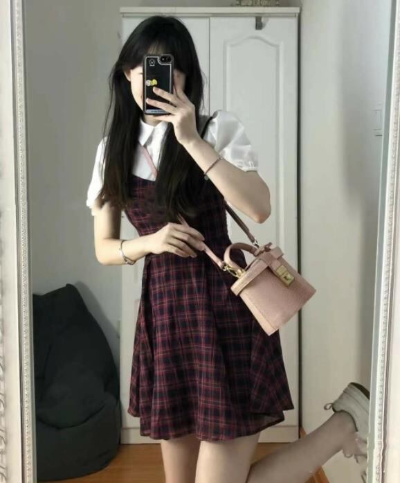 春夏新作 女 レディース ハイウエスト 半袖 チェック柄 ミニ ワンピース ドレス 台型スカート S-LEERMJNB3697023