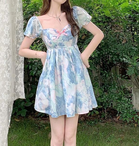 春夏新作 女 レディース ハイウエスト 半袖 パフスリーブ ミニ ワンピース ドレス 台型スカート S-2XLYUIKJMP26398028