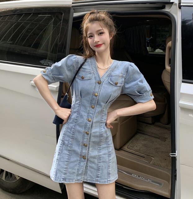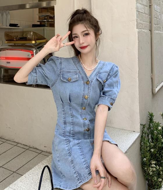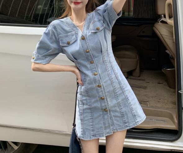 春夏新作 女 レディース ハイウエスト 半袖 Vネック デニム ミニ ワンピース ドレス タイトスカートGYTRMZ369851007