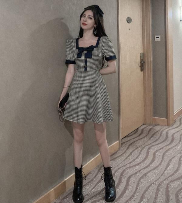 春夏新作 女 レディース ハイウエスト 半袖 チェック柄 ミニ ワンピース ドレス 台型スカート S-2XLGYTRMZ369851013