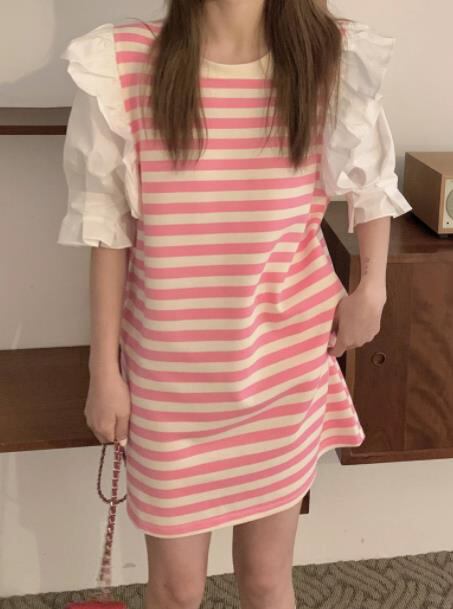 春夏新作 女 レディース ハイウエスト 半袖 ボーダー柄 ミニ ワンピース ドレス 台型スカート 2色GYTRMZ3698510132