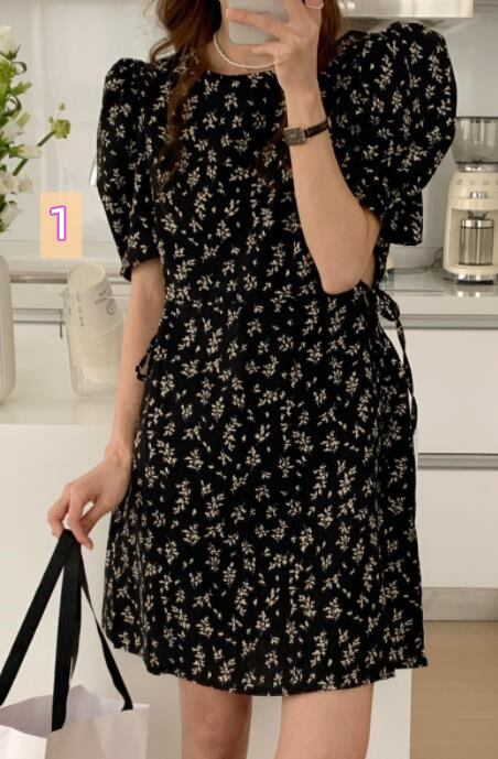 春夏新作 女 レディース 半袖 花柄 パフスリーブ ハイウエスト ミニ ワンピース ドレス 台型スカートGYTRMZ369851035