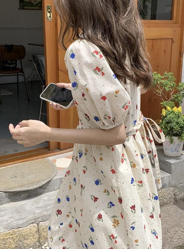 春夏新作 女 レディース ハイウエスト 半袖 花柄 ロング ワンピース 台型スカート 2色TYNBDJ235871002