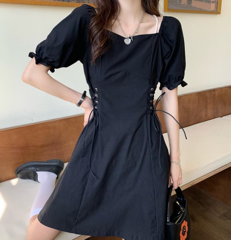 春夏新作 女 レディース ハイウエスト 半袖 無地 ミニ ワンピース ドレス 台型スカート 3色TYNBDJ235871009a
