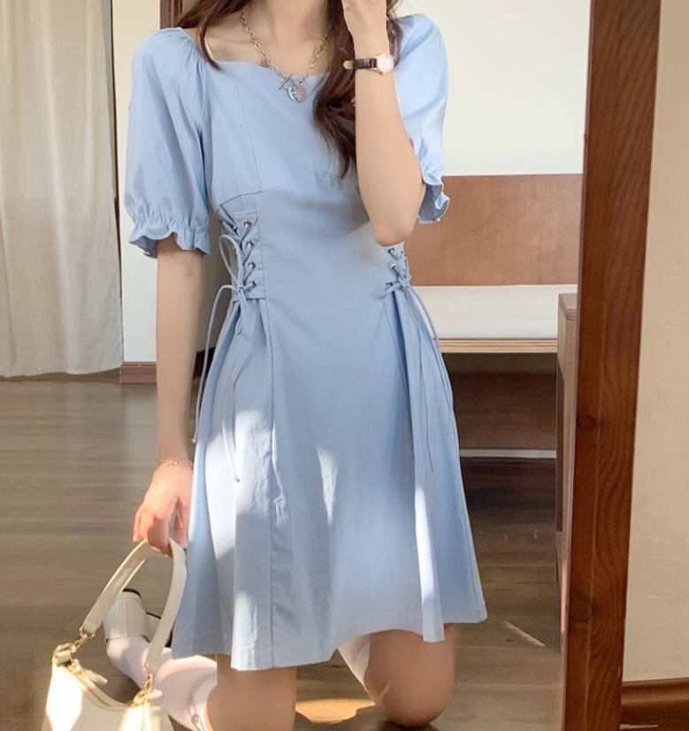春夏新作 女 レディース ハイウエスト 半袖 無地 ミニ ワンピース ドレス 台型スカート 3色TYNBDJ235871009b