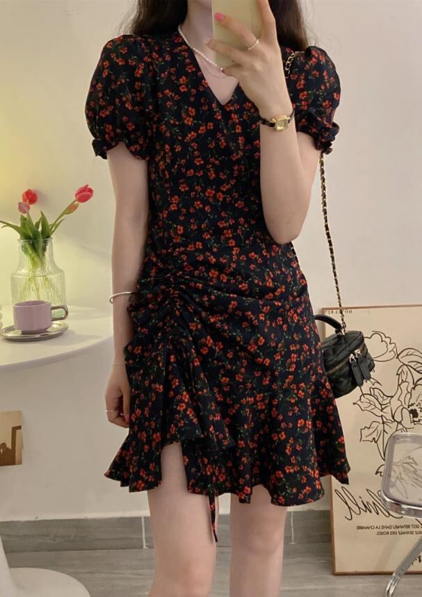 春夏新作 女 レディース ハイウエスト 半袖 パフスリーブ ミニ ワンピース ドレス 台型スカートTYNBDJ235871035