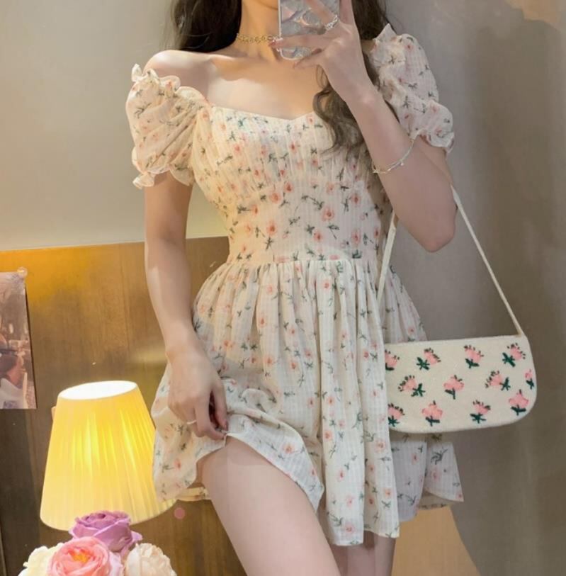 春夏新作 女 レディース 半袖 花柄 パフスリーブ ハイウエスト ミニ ワンピース ドレス 台型スカートTYNBDJ235871057