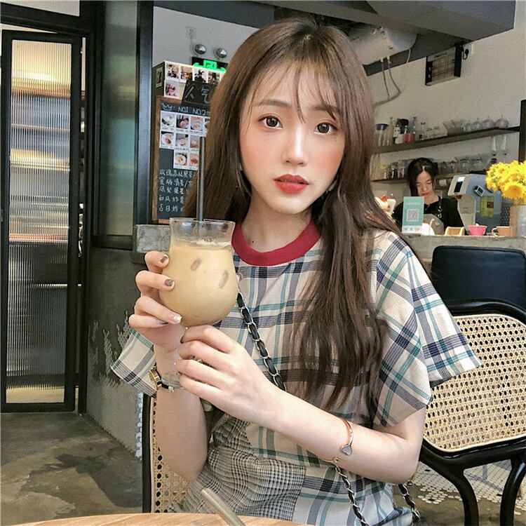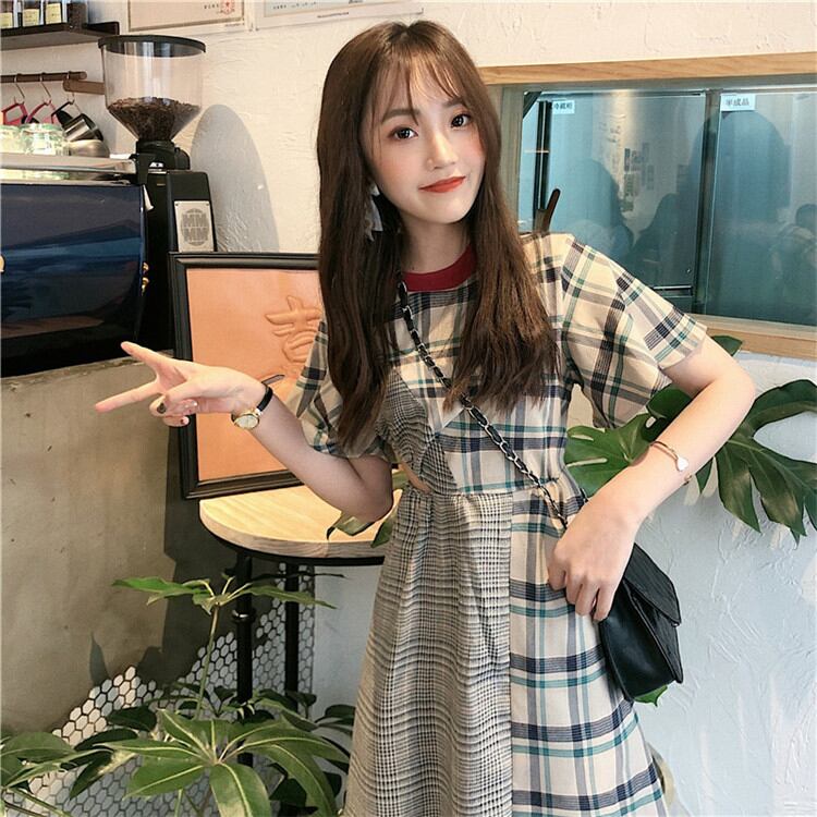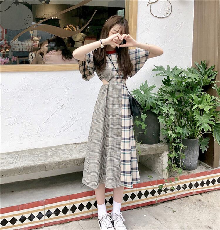 1枚でコーデ簡単 スリム レトロ 学生 透かし彫り 縫付 格子縞 半袖 ワンピースユニークなデザインKKIUJH12698a