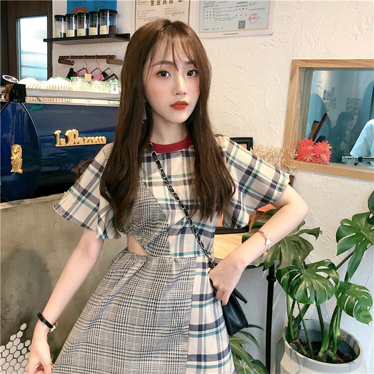 1枚でコーデ簡単 スリム レトロ 学生 透かし彫り 縫付 格子縞 半袖 ワンピースユニークなデザインKKIUJH12698b