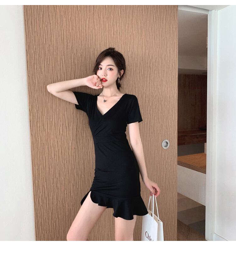 セクシー スプリット フィッシュテール バッグヒップ Vネック半袖 ワンピース 気質