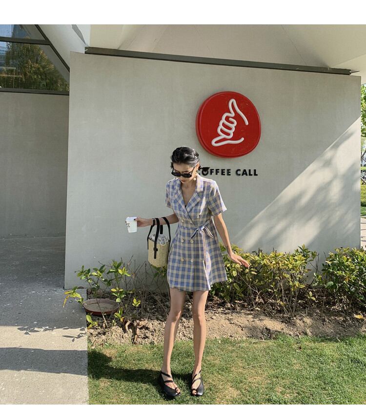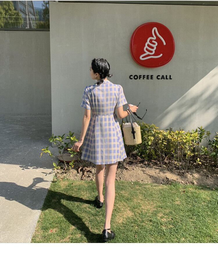 今の季節にちょうどいい 夏 韓国語版 高品質 レトロ 格子縞 スーツネック ワンピース 半袖 バンディングKKIUJH12702b