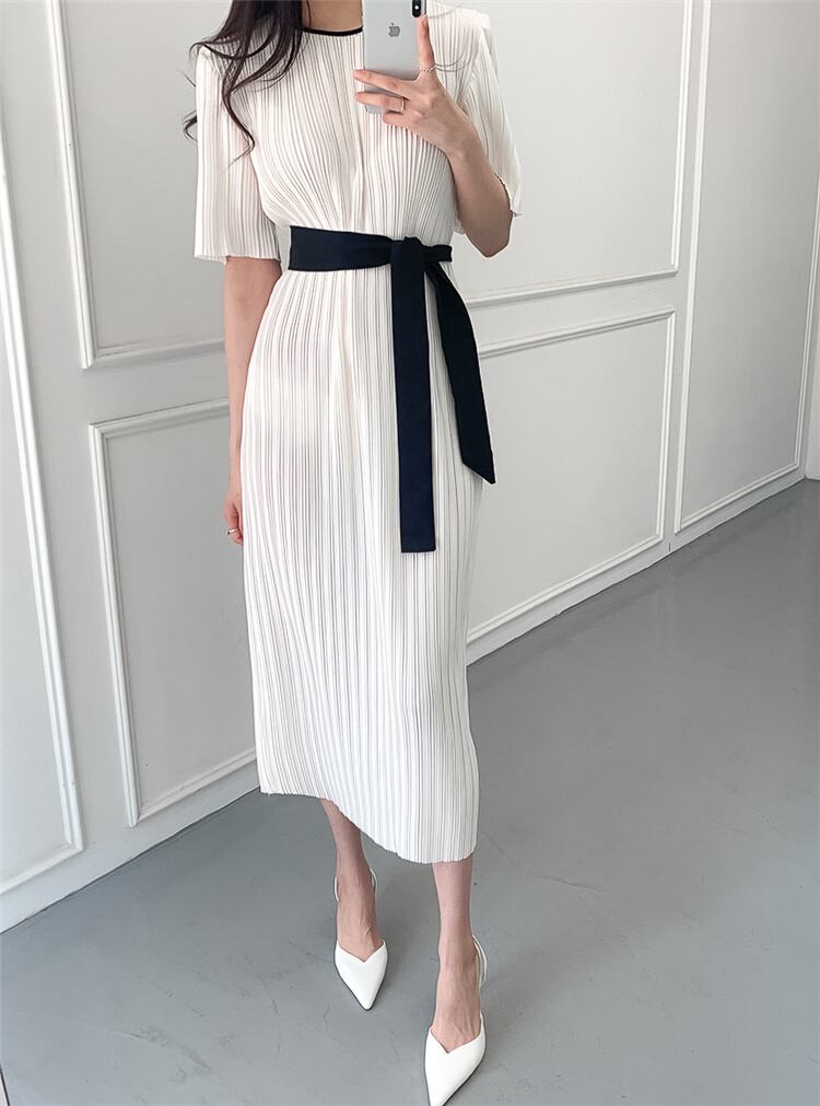 通勤する 気質 エレガント 簡約 ラウンドネック プリーツ バンディング 半袖 ワンピース