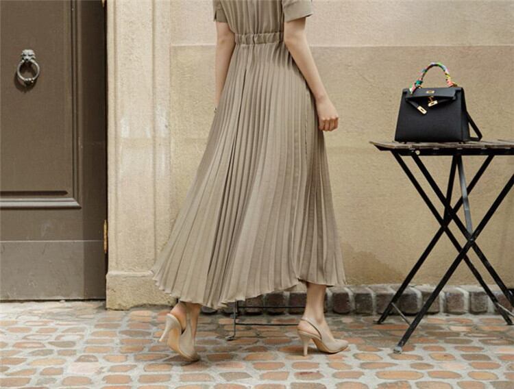 2021 夏 新品 OL 気質 スーツネック 半袖 腰を括る プリーツ 大きい裾 職業 ワンピース