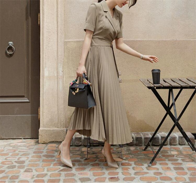 コーデを格上げ 2021 夏 新品 OL 気質 スーツネック 半袖 腰を括る プリーツ 大きい裾 職業 ワンピースKKIUJH12713a