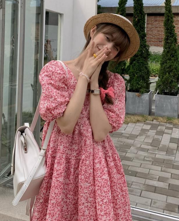 春夏新作 女 レディース ハイウエスト 半袖 花柄 パフスリーブ ミニ ワンピース ドレス 台型スカートMKUIHT25126140