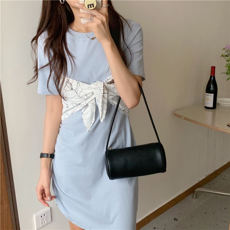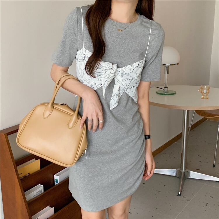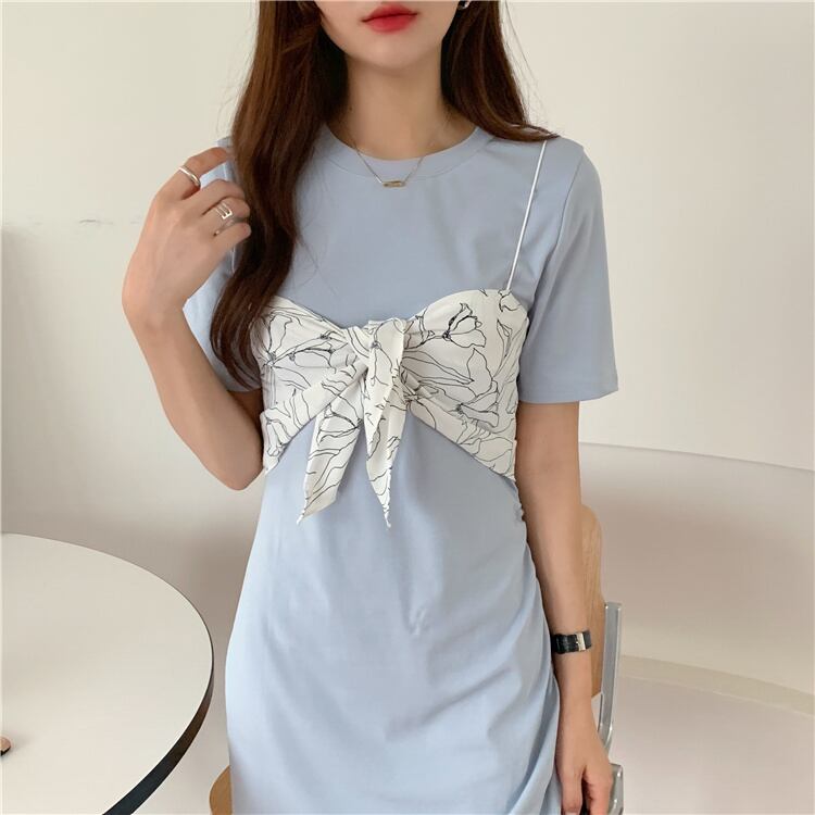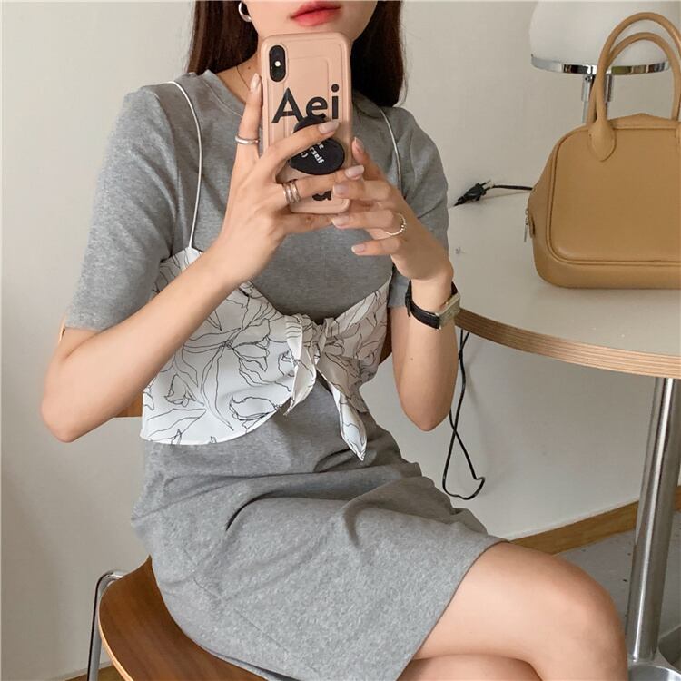 韓国ファッション スリム 半袖 ワンピース プリント ベアトップ 2点セット 百掛け
