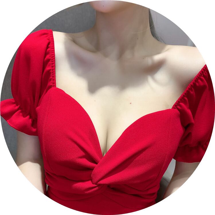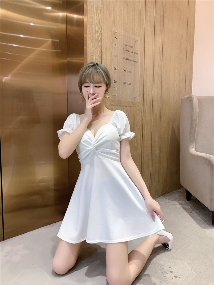 INSスタイル ウエストを収める 背透けて 深いVネック 半袖 ワンピース