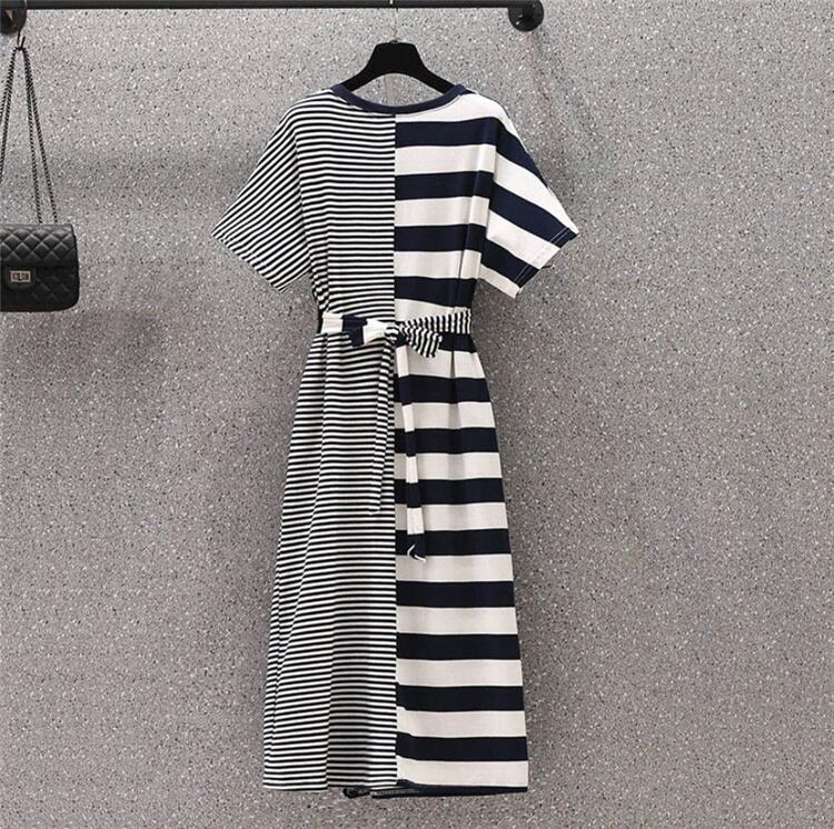コーデに輝きを添える。通勤する 大きいサイズ 減齢 カバー腹 スリム ボーダー 縫付 半袖 ワンピースTREWPL36975120a