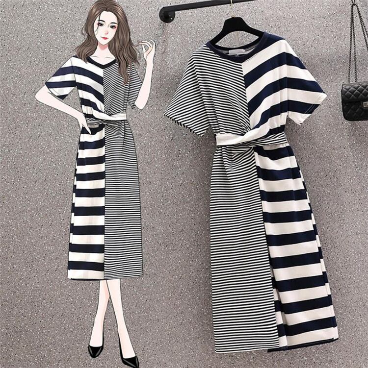 コーデに輝きを添える。通勤する 大きいサイズ 減齢 カバー腹 スリム ボーダー 縫付 半袖 ワンピースTREWPL36975120b