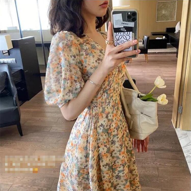 シフォン 半袖 Vネック 花柄ワンピ 小さい新鮮な sweet系 気質 おしゃれな 大人気 お出かけ