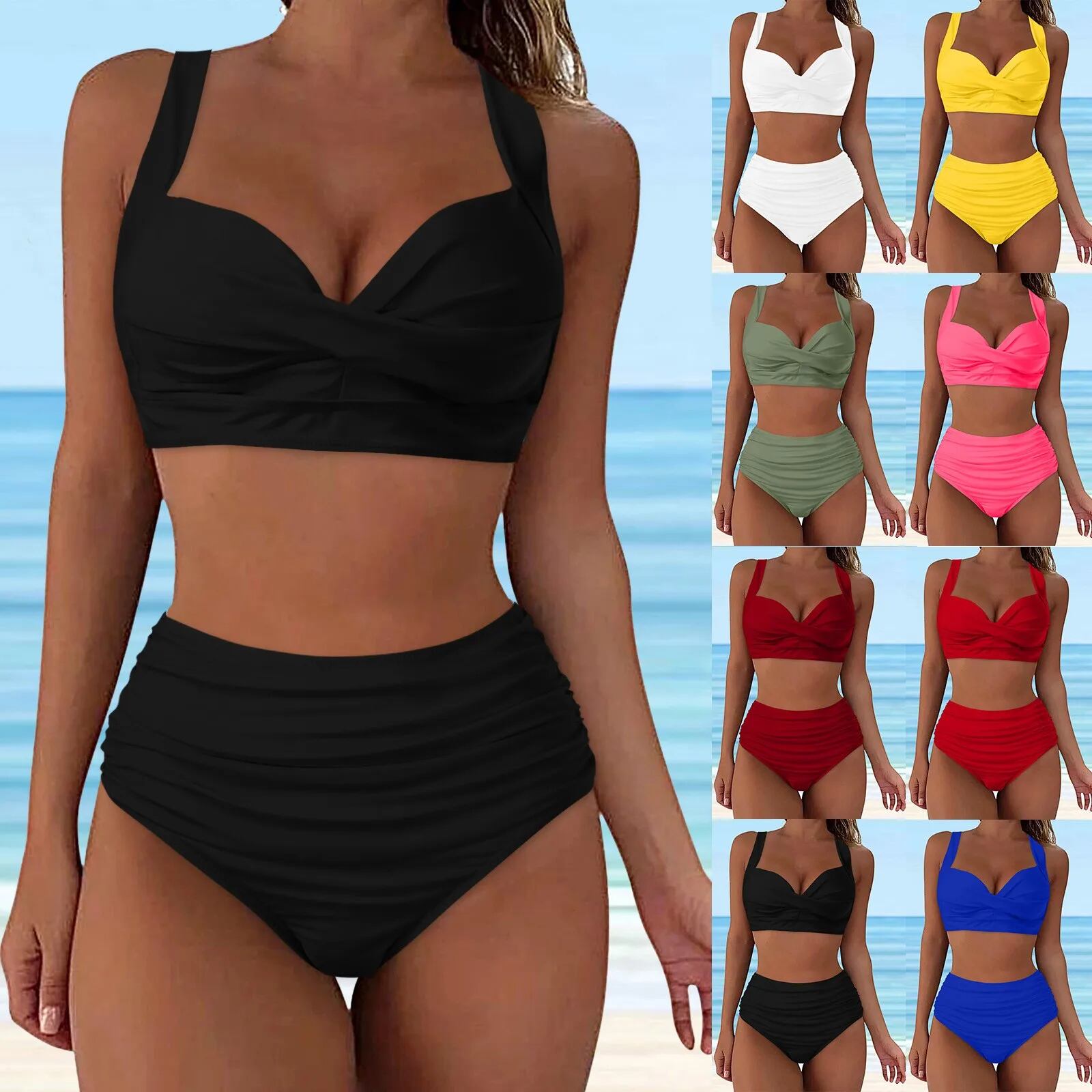女性のハイウエストプッシュアップビキニ、セクシーなクラシック水着、無地、しわのあるレースアップ水着、2個 ビキニ Tシャツ T240619005557_02