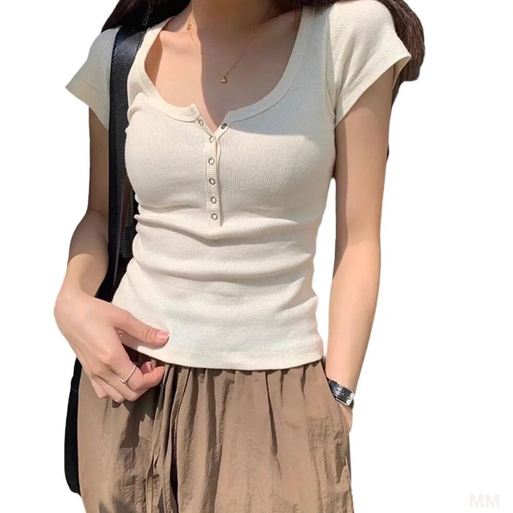 女性用半袖Tシャツ,ヴィンテージ,ボタン付き,スリムフィット,タイト,レトロ,3色,カジュアル,夏,新品 Tシャツ シャツ T240619151645_03