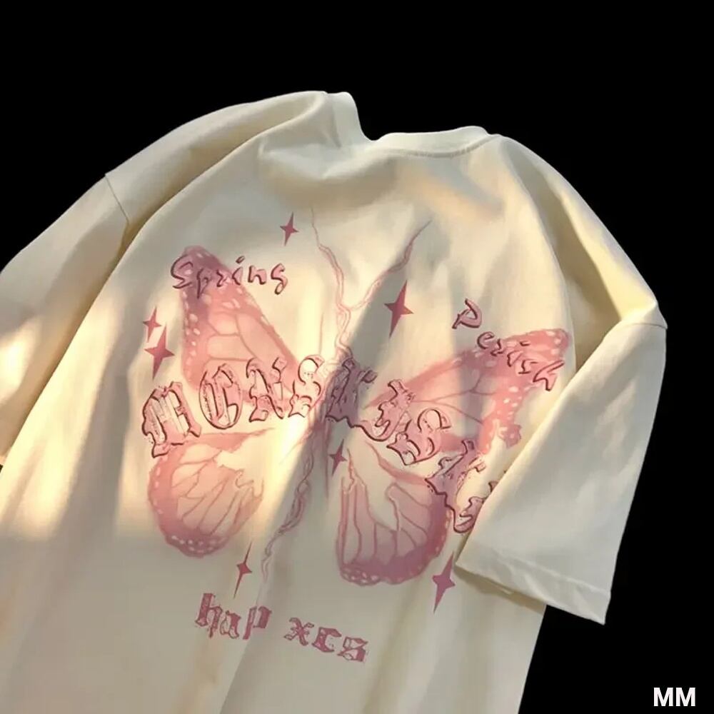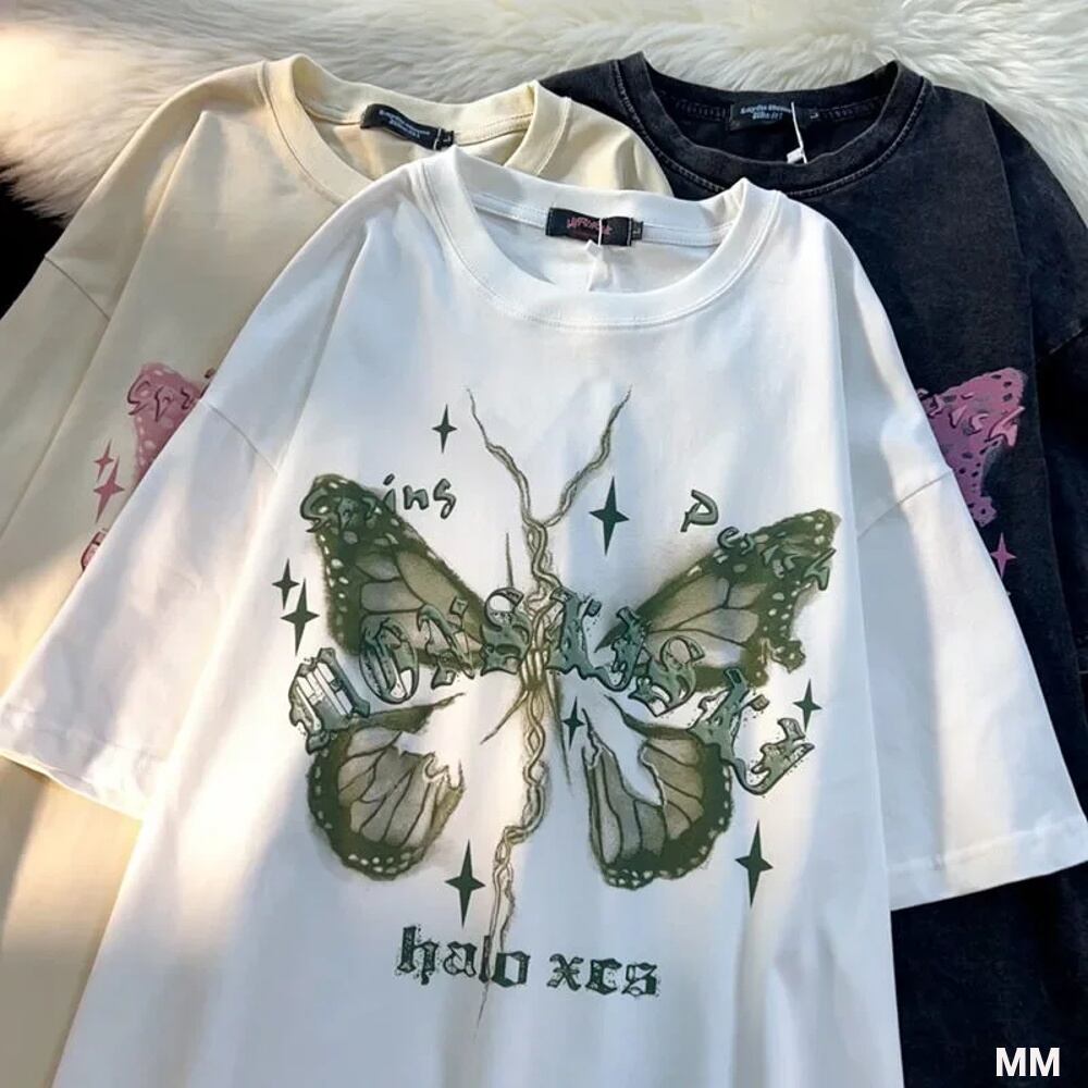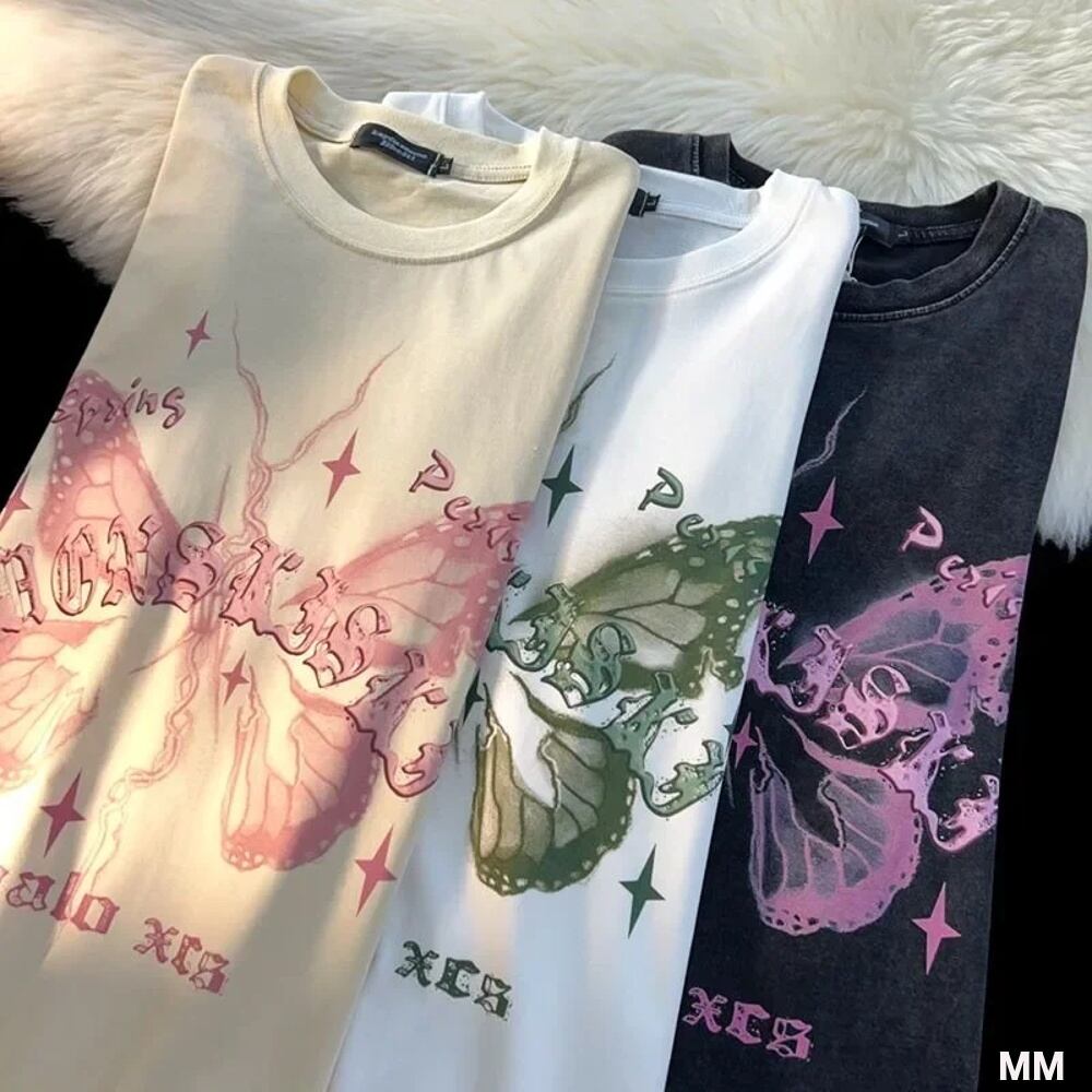 アメリカのレトロな純綿のバタフライプリントTシャツ,男性と女性のための半袖Tシャツ,大きくて用途の広いトップ Tシャツ シャツ T240619152158_01
