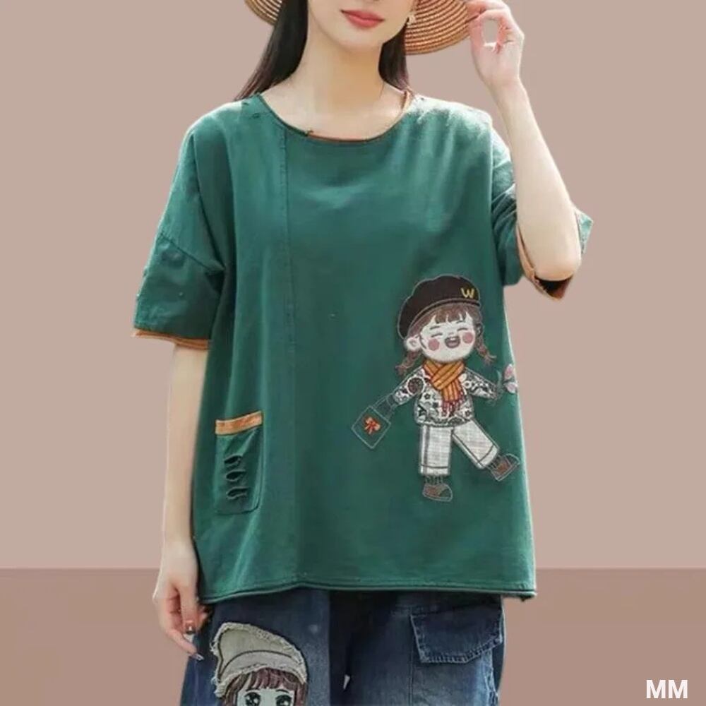 女性の芸術的なレトロな漫画の刺繍Tシャツ、ラウンドネックのトップス、ゆったりとしたポケット、ディストレスト半袖、夏、新しいTシャツ、2024 Tシャツ シャツ T240619152225_04