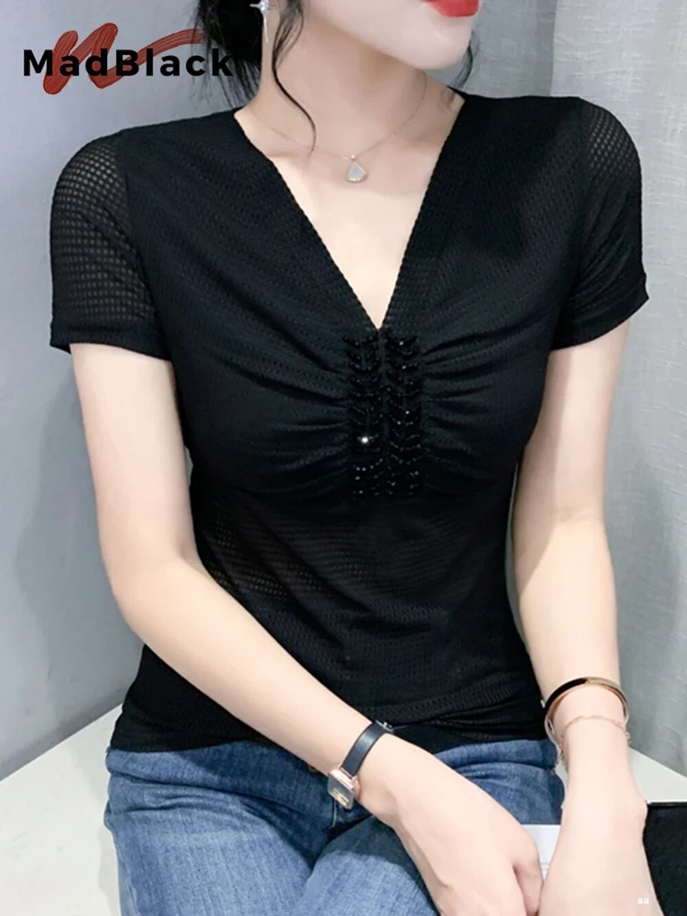 Fashion:MadBlack Summer European Clothes V Necks T-Shirt Sexy Ins Style Luxury Diamonds Women Short Sleeves Slim Tops Tees New 2023