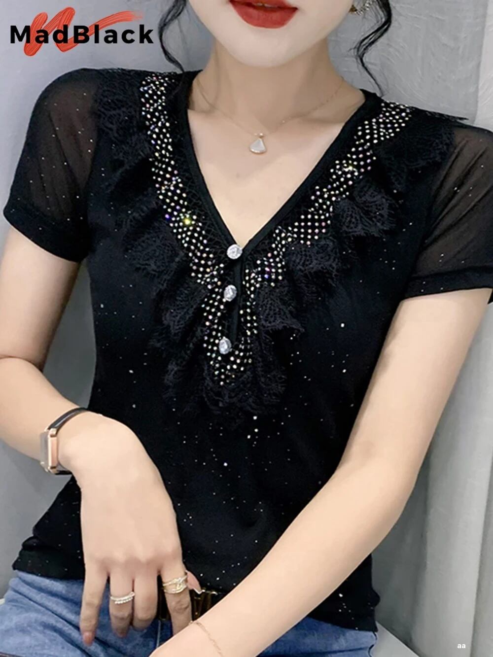 女性用Vネックの光沢のあるフリルTシャツ,半袖のセクシーな服,裸の肩,黒,夏,ヨーロッパスタイル,t25511l ボトム ボトムス ズボン T240619134441_01