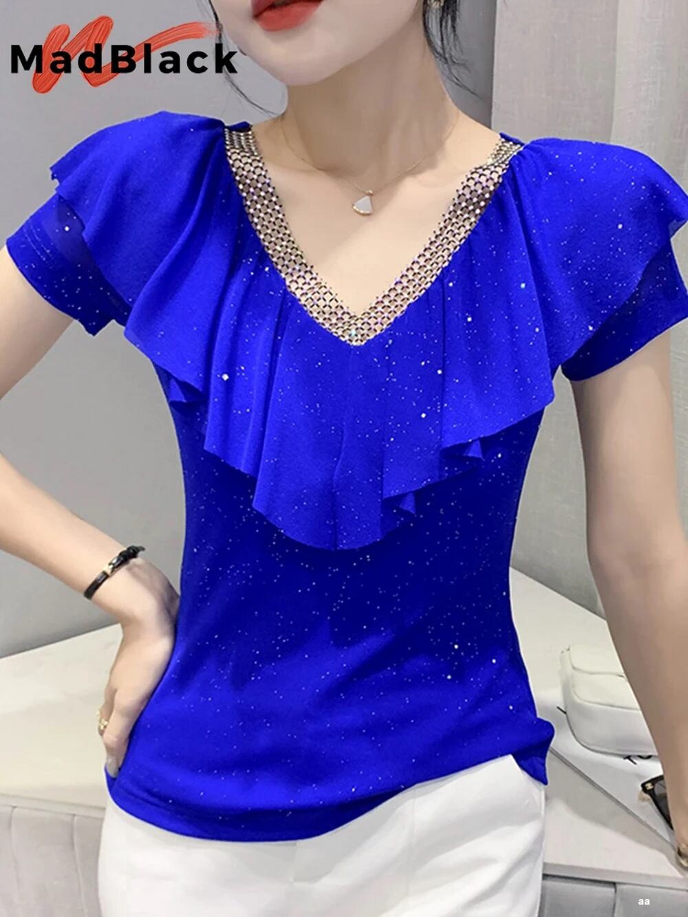 女性用Vネックの光沢のあるフリルTシャツ,半袖のセクシーな服,裸の肩,黒,夏,ヨーロッパスタイル,t25511l ボトム ボトムス ズボン T240619134441_03