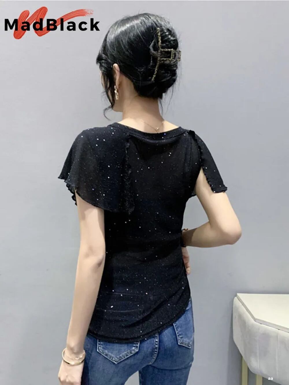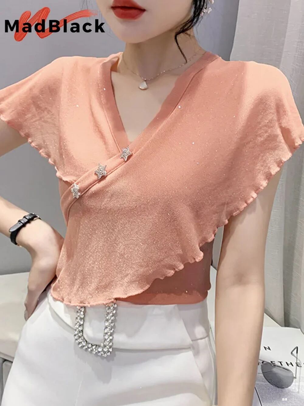 女性用半袖シャツ,婦人服,ヨーロピアンスタイル,Vネック,セクシー,光沢のあるフリル,すべてに伸縮性のあるトップス,T25611l ボトム ボトムス ズボン T240619134451_02