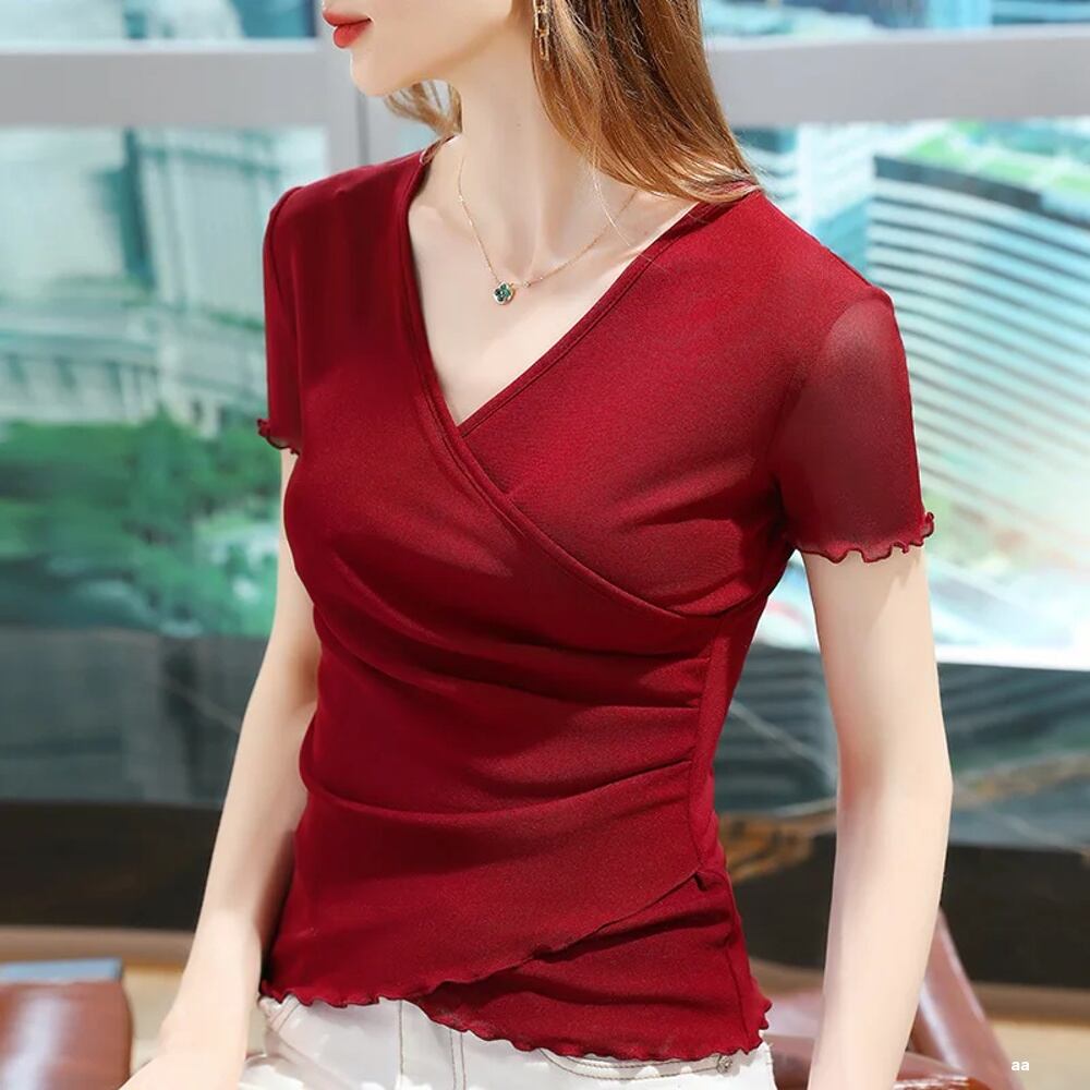 クロスvネック半袖tシャツ女性の2021夏新女性の無地メッシュ底入れ耳ストレッチトップ|Tシャツ| ボトム ボトムス ズボン T240619134454_01