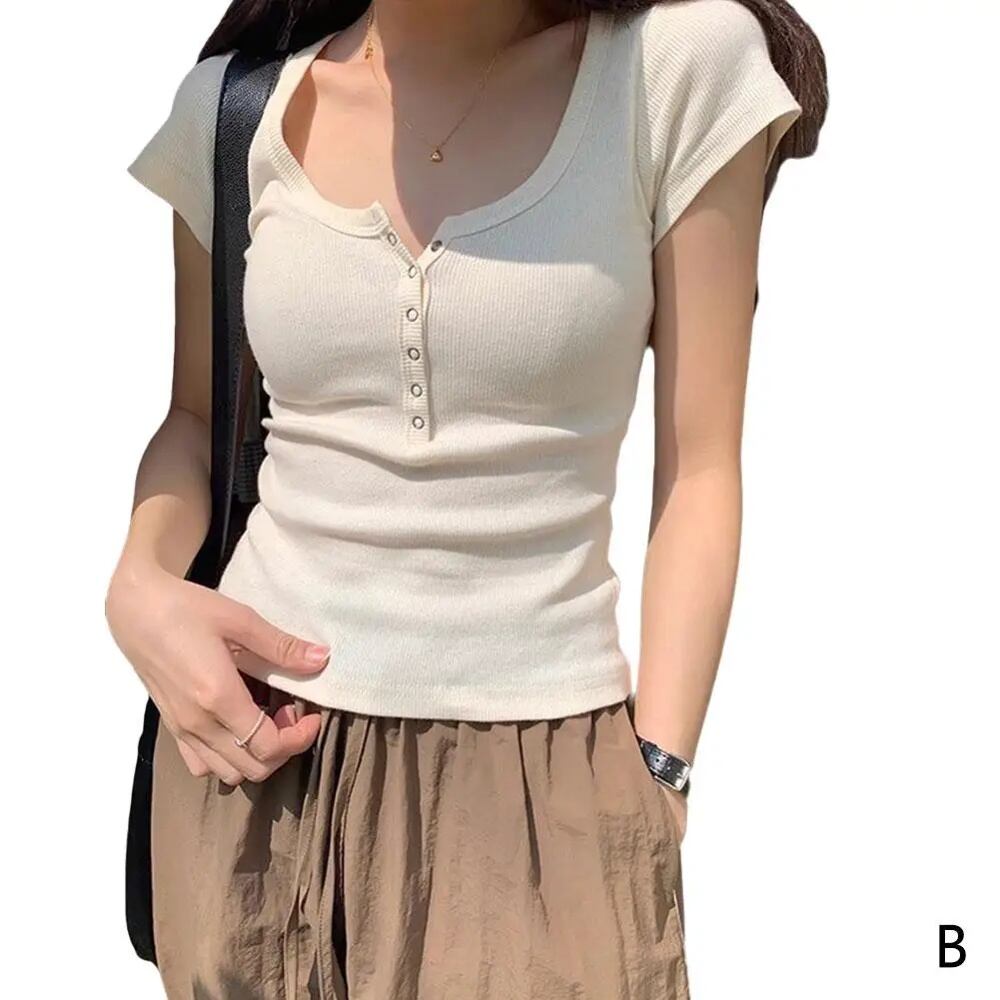 女性用半袖Tシャツ,ヴィンテージ,ボタン付き,スリムフィット,タイト,レトロ,3色,カジュアル,夏,新品 ボトム ボトムス ズボン T240619151645_01