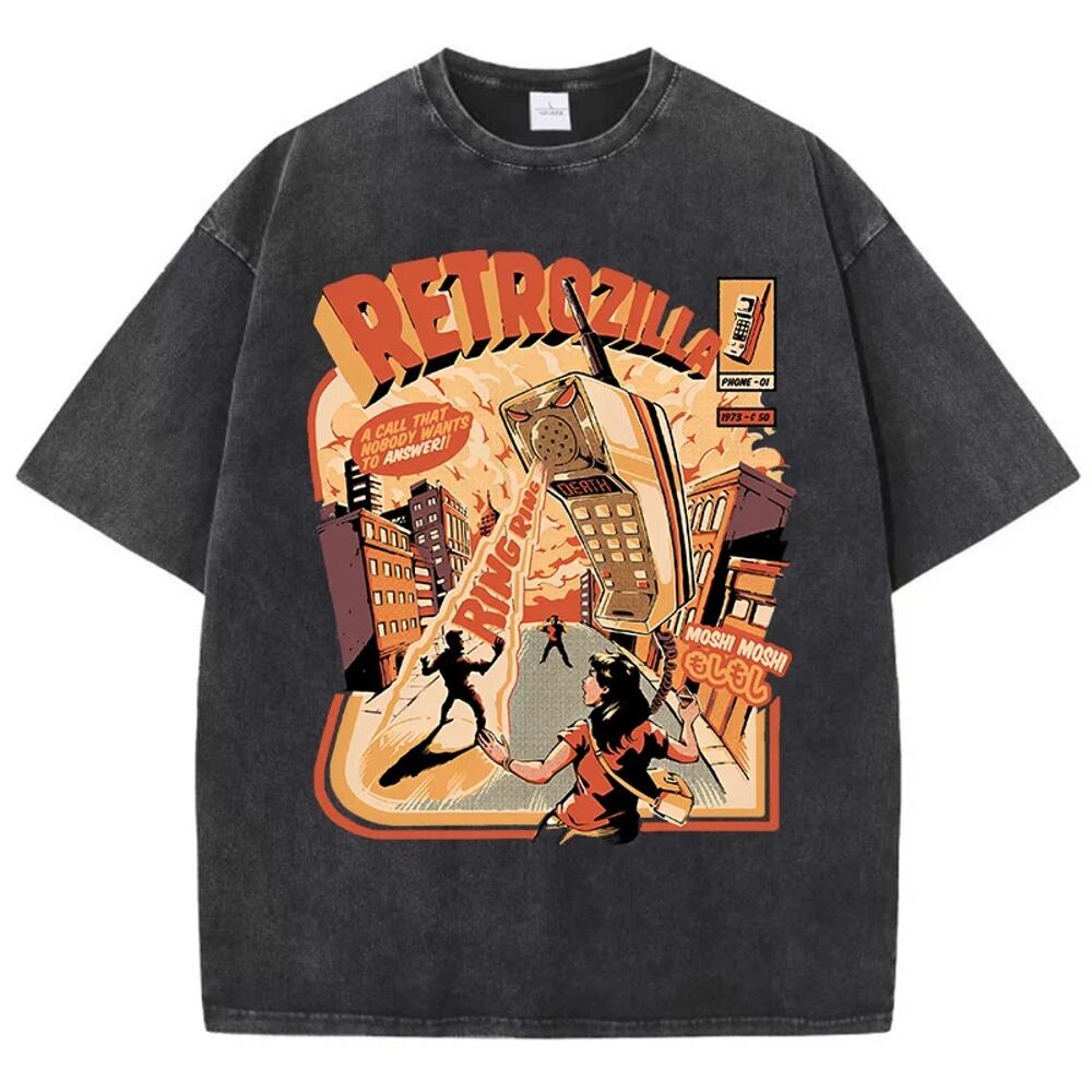 女性のレトロなphoneillaプリントTシャツ、夏のラウンドネックTシャツ、ストリートヒップホップの服、通気性のあるウォッシュコットン、半袖 ボトム ボトムス ズボン T240619151915_01