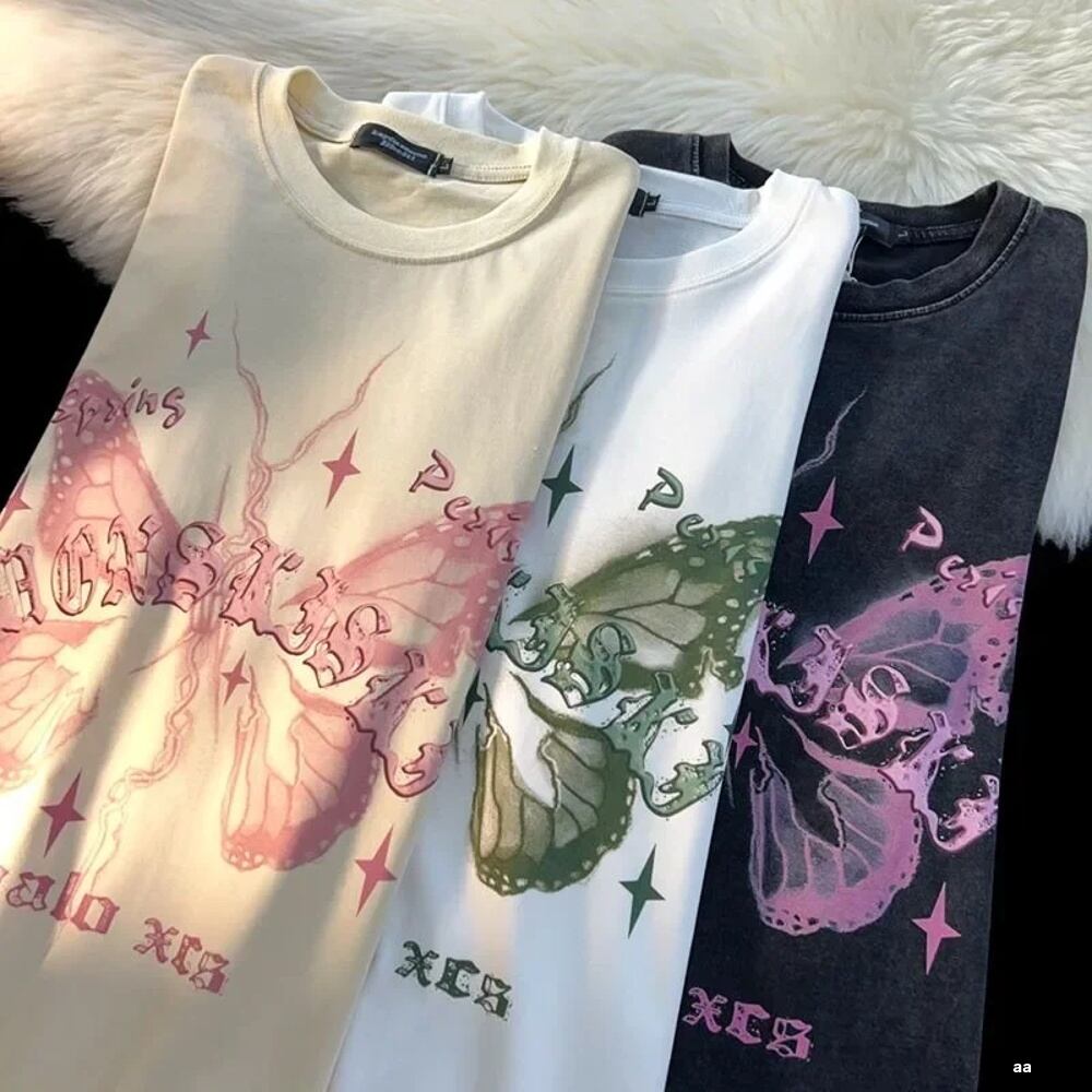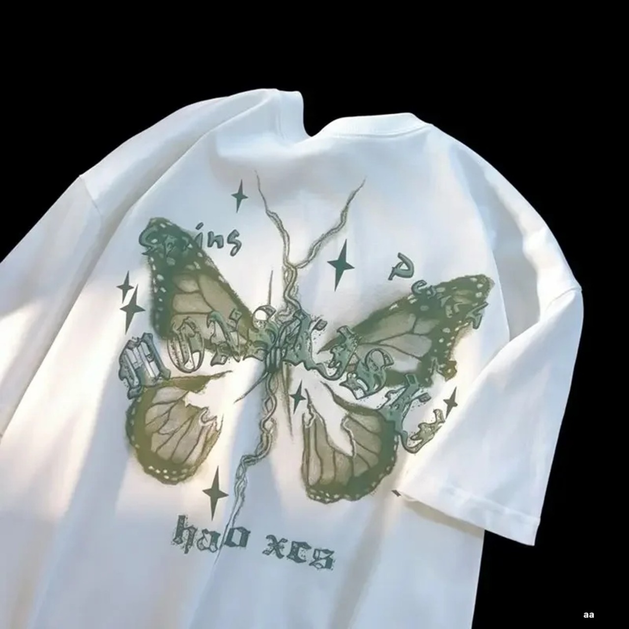 アメリカのレトロな純綿のバタフライプリントTシャツ,男性と女性のための半袖Tシャツ,大きくて用途の広いトップ ボトム ボトムス ズボン T240619152158_02