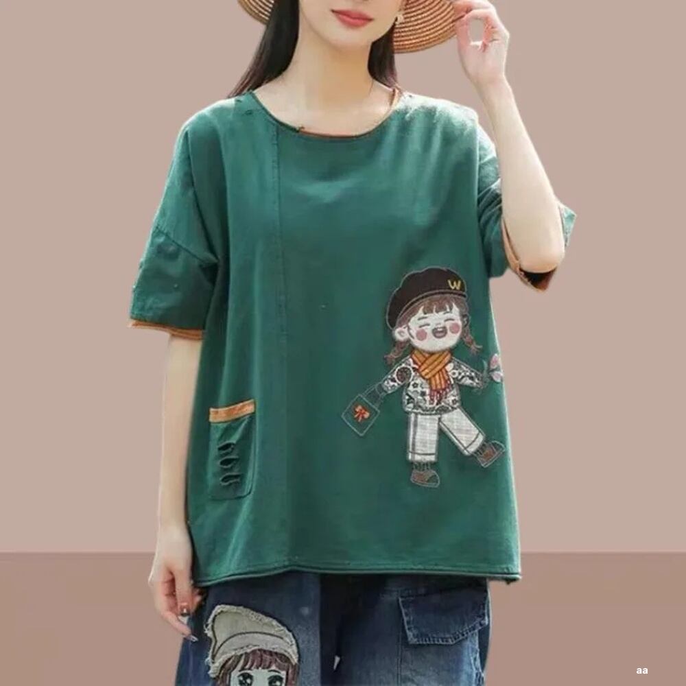 女性の芸術的なレトロな漫画の刺繍Tシャツ、ラウンドネックのトップス、ゆったりとしたポケット、ディストレスト半袖、夏、新しいTシャツ、2024 ボトム ボトムス ズボン T240619152225_02