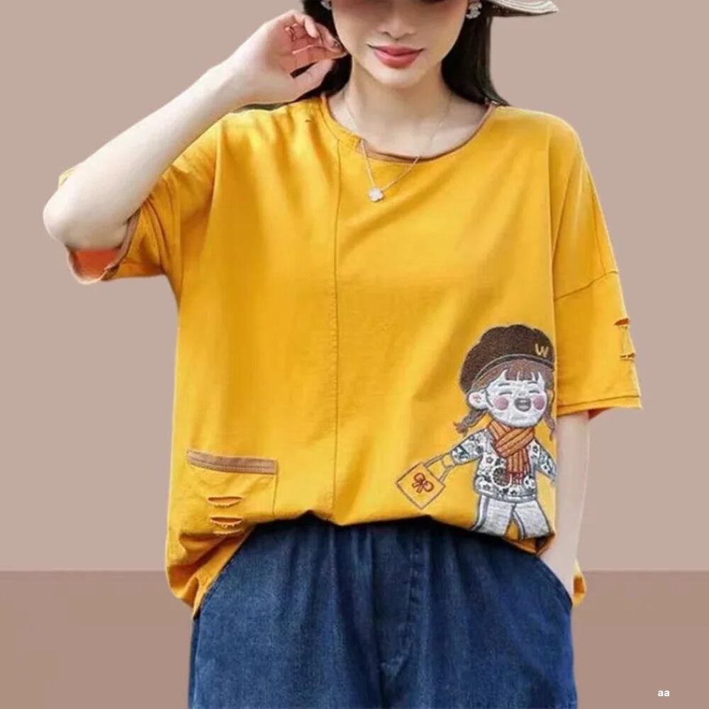 女性の芸術的なレトロな漫画の刺繍Tシャツ、ラウンドネックのトップス、ゆったりとしたポケット、ディストレスト半袖、夏、新しいTシャツ、2024 ボトム ボトムス ズボン T240619152225_03
