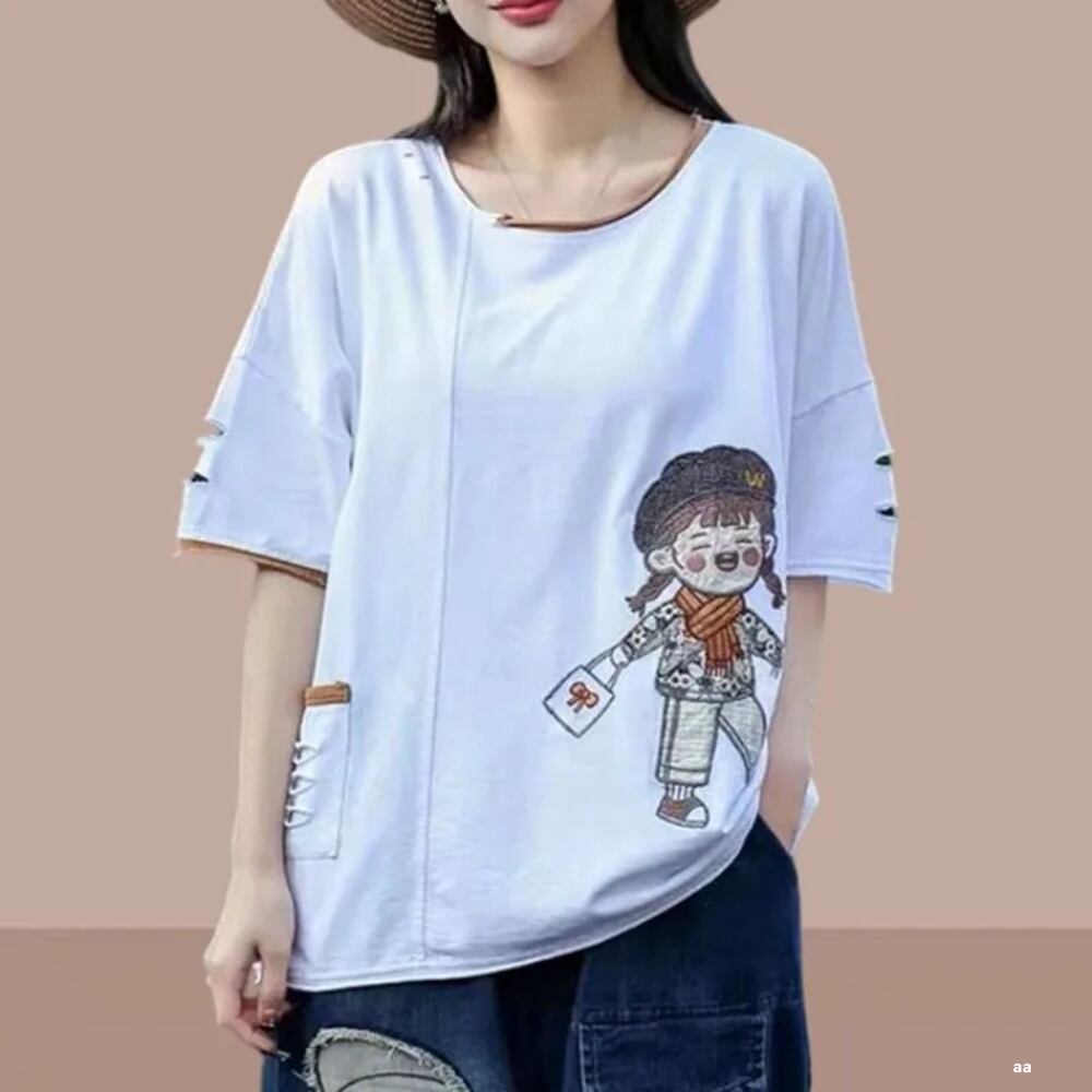 女性の芸術的なレトロな漫画の刺繍Tシャツ、ラウンドネックのトップス、ゆったりとしたポケット、ディストレスト半袖、夏、新しいTシャツ、2024 ボトム ボトムス ズボン T240619152225_04