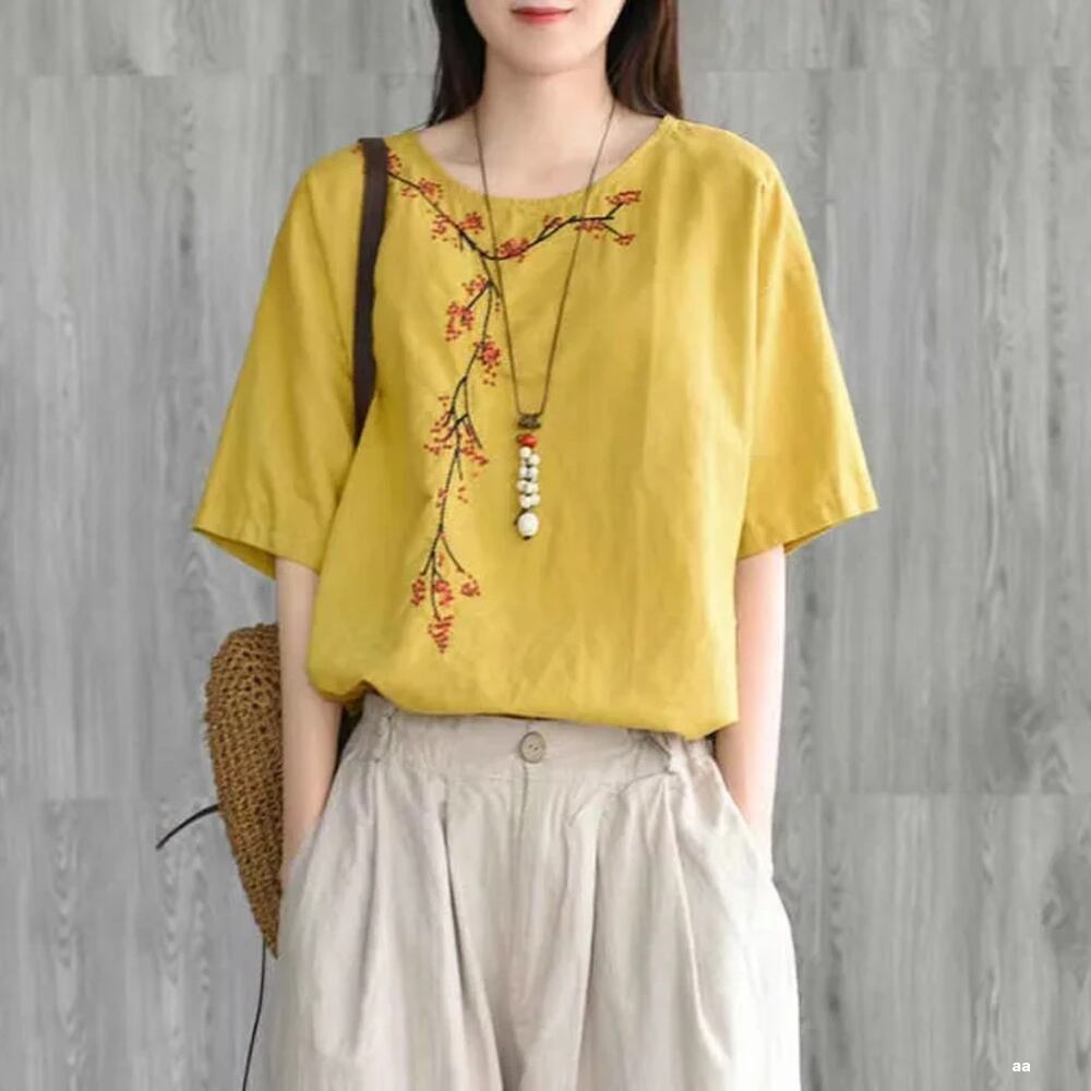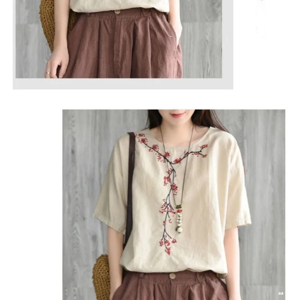 女性のための刺embroideredのあるラウンドネックTシャツ,半袖,ルーズでカジュアル,レトロなスタイル,綿,刺tops,無地,新しい夏のコレクション2023 ボトム ボトムス ズボン T240619152352_01