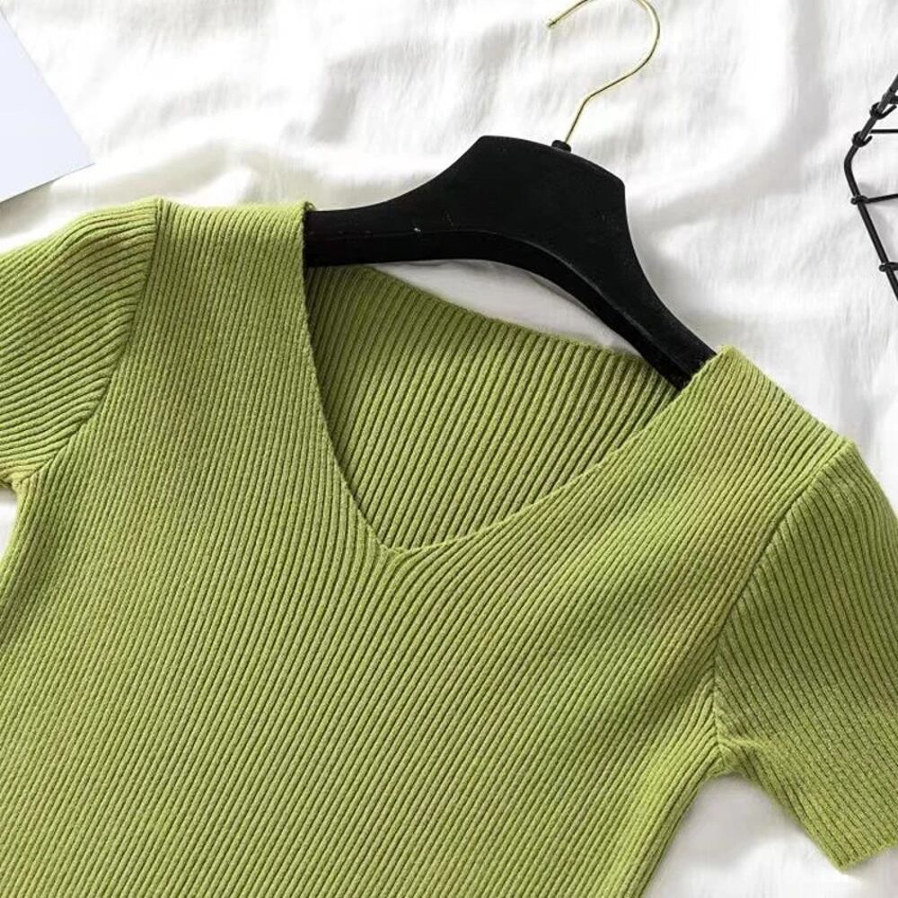 女性のためのデイジーニットTシャツ,ソフトニットトップス,Vネック,半袖,スリムフィット,レトロ,キュート,夏|Tシャツ| ボトム ボトムス ズボン T240619152433_05