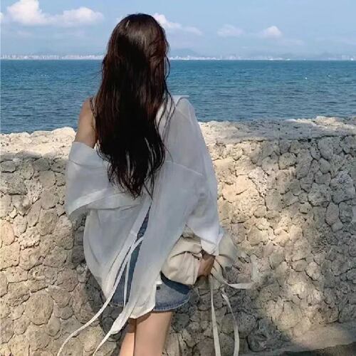女性用長袖日焼け止めシャツ,韓国のファッション,背中の分割,レースアップ,白,カジュアル,ルーズ,休暇,ビーチブラウス