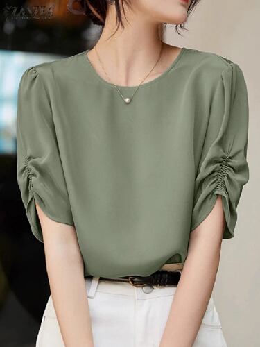 Zanzea-o-女性用ネックブラウスシャツ,半袖シャツ,無地のパーティーチュニック,エレガントな女性のシャツ,オフィスのファッション,夏,2022
