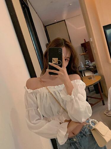 裸の肩,長袖,フラウンス,セクシーなブラウス,白いシャツ,パフスリーブ,単色のチューブトップ,夏