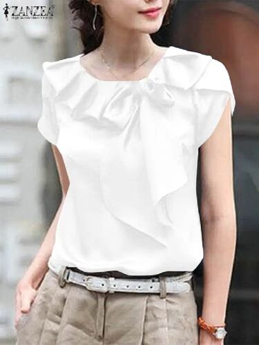 Zanzea-レディースシック半袖ブラウス、エレガントな蝶ネクタイのステッチシャツ、単色、オフィス、ラウンドネック、チュニック、カジュアルなルーズフィットトップス