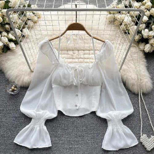 フレンチシックなホルターブラウスfemininas弓フレアスリーブショートップス婦人highstreet blusa mujerカジュアルシャツ服ドロップシッピング