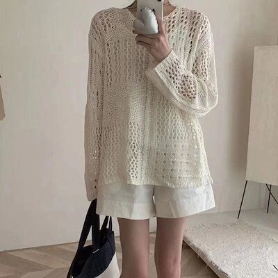 トップス ブラウス 夏 韓国 あちこち やせて見える ゆとりがある 日焼け止めの上着シースルー ボーダー ニット