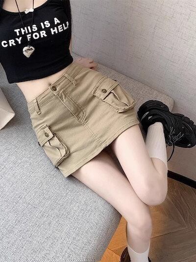スカルト春秋 カーキ色 ハイウエスト やせて見える 美脚 韓国ファッション タイトスカート レディー ins