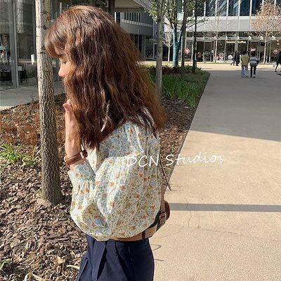 長袖シャツ トップス 秋 簡単な カジュアル 韓国系 復古 ライトグリーン 花柄のシャツ ファッション 百掛け やせて見える