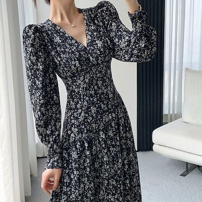 花柄ワンピース 2024 秋 新作 秋の新作長袖フレンチ薄手気質Vネックロングドレス